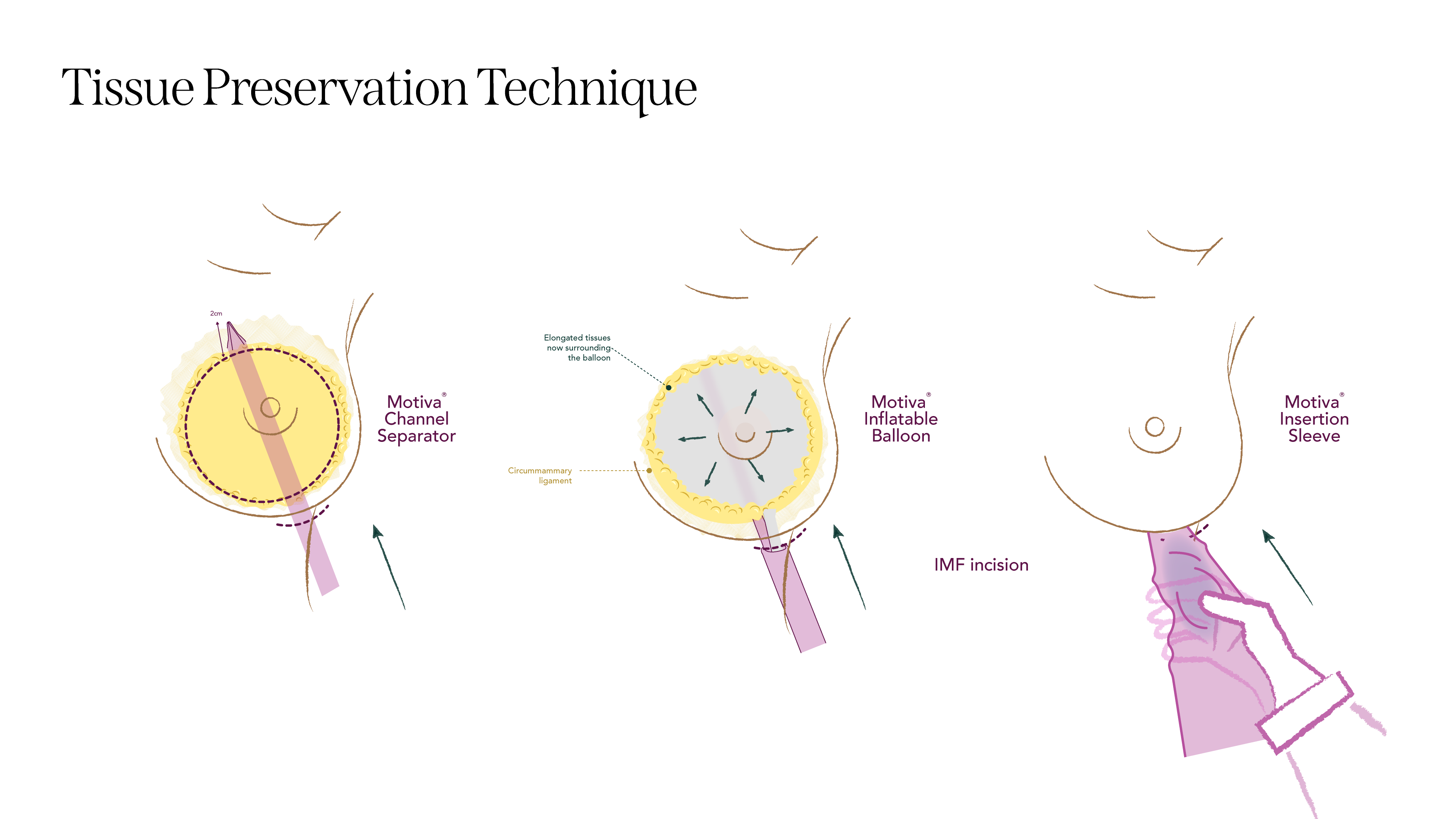 Bei der Preservé™-Brustvergrösserung setzen wir auf eine gewebeschonende Präparation der Implantattasche und auf aktuelle Implantattechnologie (Motiva® Ergonomix2® Implantate). Ziel: ein natürlich wirkendes Ergebnis, möglichst geringe Gewebetraumen und eine spürbar komfortable Erholungsphase.
